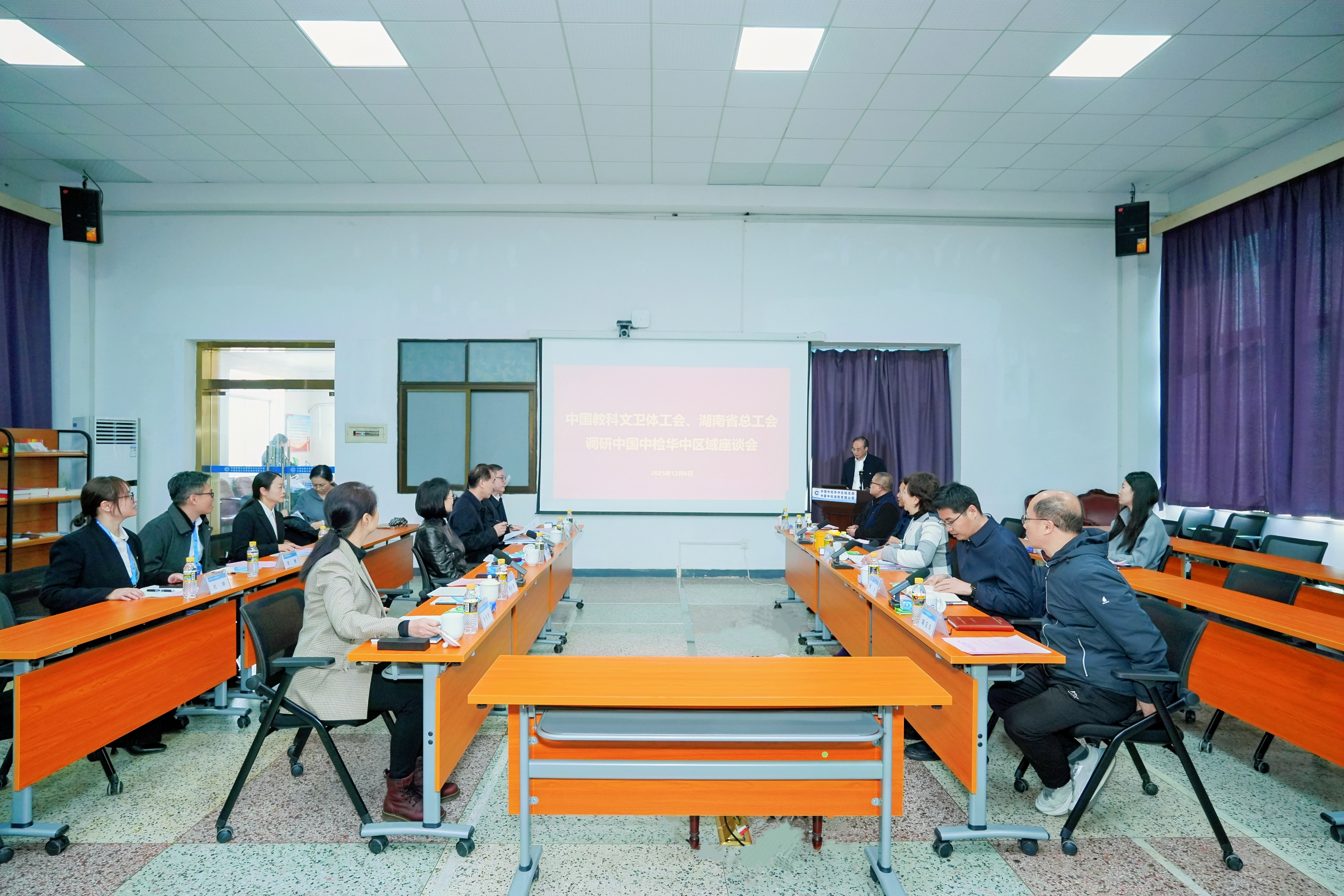 12月6日,中国教科文卫体工会主席、分党组书记高洁,副主席候选人、分党组成员李杰,湖南省总工会副主席黄快林,干部学校(湖南省工匠学院)副校长龙巨澜一行赴华中区域公司调研工匠学院建设情况。中国中检党委副书记、职工董事、集团工会主席张玉辉出席,集团党群工作部主任、集团工会常务副主席陈文宇,华中区域公司党委书记、董事长、总经理刘向荣等陪同调研并进行座谈交流。