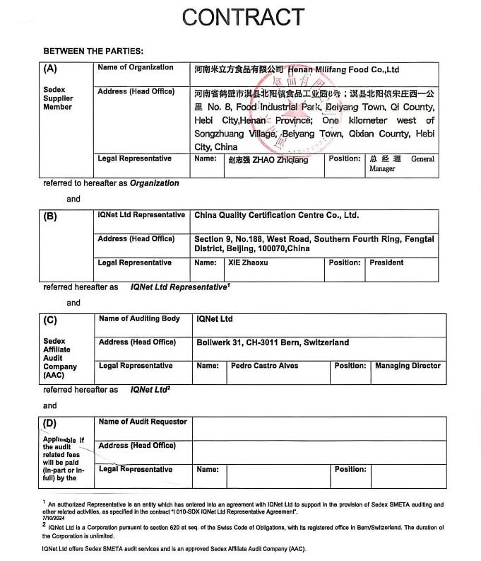 河南公司下属鹤壁公司与河南米立方食品有限公司签订社会责任评价(Sedex SMETA Audit)合同,通过指导企业系统排查风险、改善劳资关系、保障合规等方式,提升企业声誉与社会形象,助力其进军欧美市场。此举彰显 “中检力量” 在助推行业合规发展中的核心价值,是赋能地方企业 “走出去” 的关键举措。