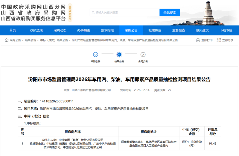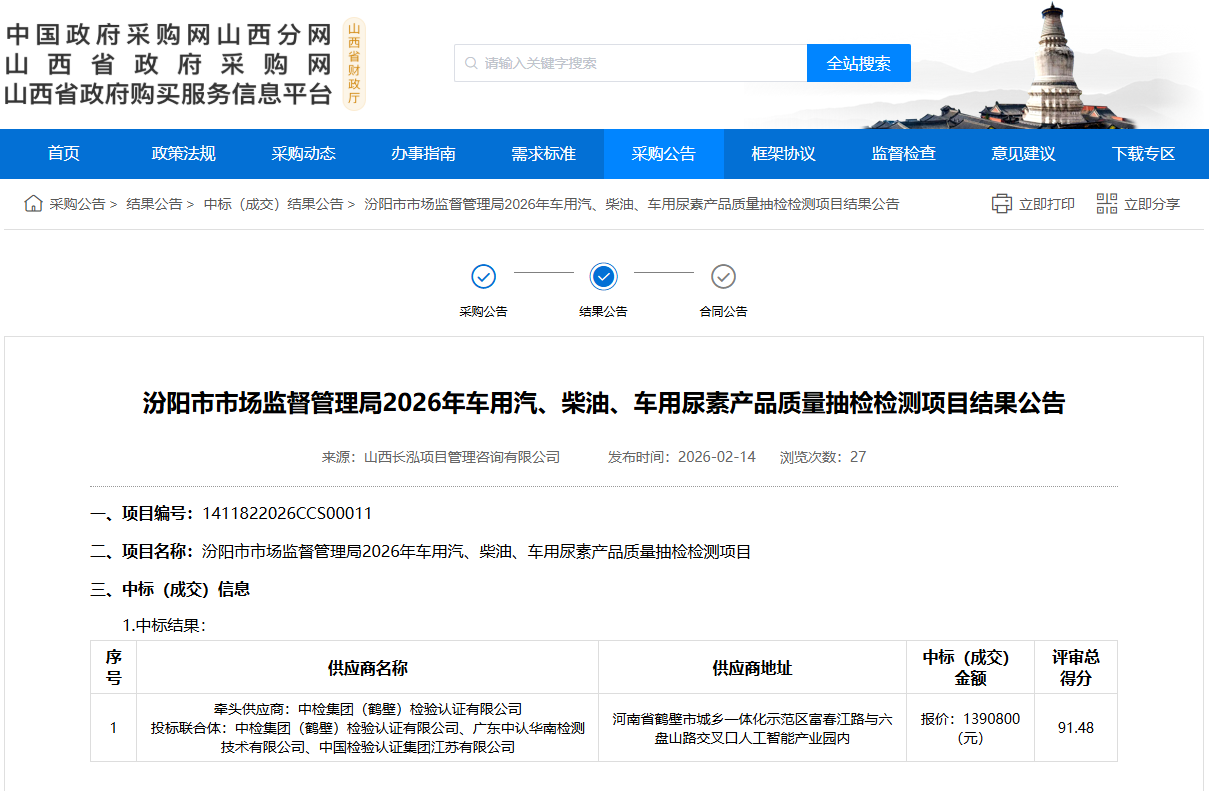 河南公司下属鹤壁公司联合华中区域公司,以139万元的成交价格共同中标汾阳市市场监督管理局车用汽、柴油、车用尿素产品质量抽检项目。此次中标充分体现了双方在业务拓展与区域协同上的有效联动,通过资源整合与优势互补,进一步提升了联合服务能力。
